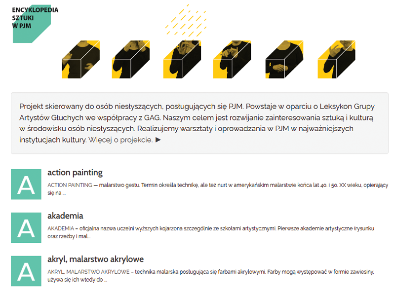 Encyklopedia sztuki w PJM to projekt skierowany do osób niesłyszących, udostępniający prawie 200 filmów-definicji w Polskim Języku Migowym. Zawiera zarówno podstawowe pojęcia artystyczne, jak i specjalistyczną terminologię, style, kierunki oraz sylwetki twórców, ułatwiając dostęp do wiedzy o sztuce.